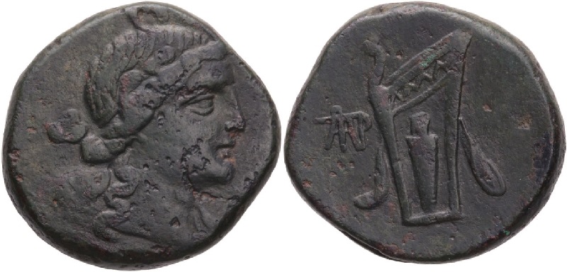 - Голова Диониса в плющевом венке вправо.