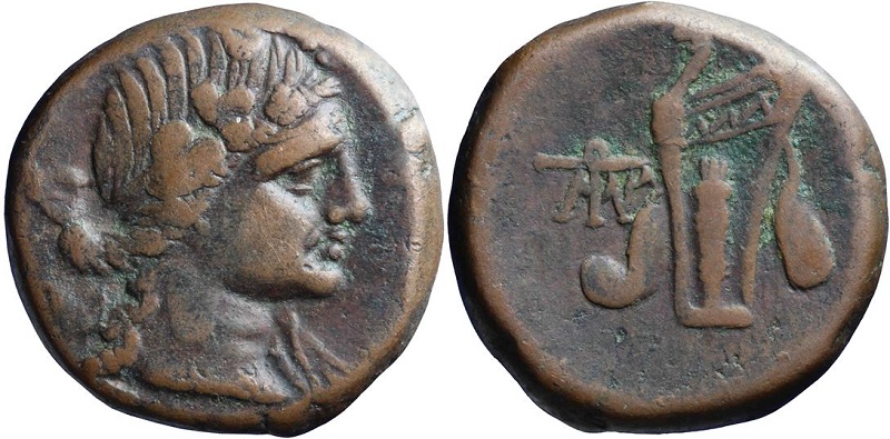 - Голова Диониса в плющевом венке вправо.