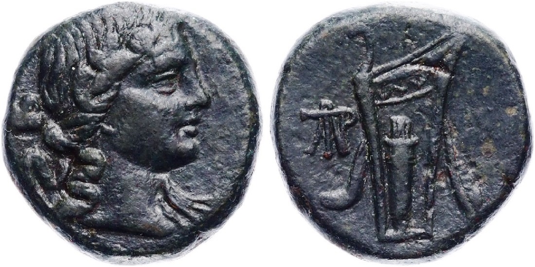 - Голова Диониса в плющевом венке вправо.