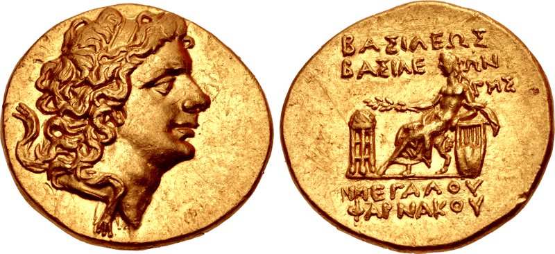 ГлавнаяКаталог монетПаспорт монеты Паспорт монеты: 216-3169-3 Дополнительная информация о монете Triton XVIII. Lot: 558. Номер:216-3169 Количество монет в архиве:4 монет Центр чеканки:Пантикапей Период чеканки: по Анохину В.А. (1986 г.)55 — 54 год до н.э. по Анохину В.А. (2011 г.)55 — 54 год до н.э. по Шелову Д.Б. по Фроловой Н.А. по MacDonald D.55 — 54 год до н.э. по Шонову И.В.55 — 54 год до н.э. Правитель, годы правления:Фарнак, 63-47 гг до н. э. Материал монеты:Золото Номинал:Статер Вес монеты:8.23 Диаметр монеты:21.0 Описание аверса:Голова царя вправо Описание реверса:ΒΑΣΙΛΕΩΣ ΒΑΣΙΛΕΩΝ ΜΕΓΑΛΟΥ ΦΑΡΝΑΚΟΥ. Аполлон на троне влево, слева треножник, справа лира и ГМΣ Номер по каталогу: Анохина В.А. (1986 г.)216 Анохина В.А. (2011 г.)1301 Шелова Д.Б.- Фроловой Н.А. MacDonald D.182 Шонова И.В.Таб. LIII, № 441, 442 Архив монет данного типа 216-3169-2 Пантикапей. 55 — 54 год до н.э. Золото Статер, вес 8.25 г, d0.0 мм 216-3169-1 Пантикапей. 55 — 54 год до н.э. Золото Статер, вес 8.11 г, d21.0 мм 216-3169-3 Пантикапей. 55 — 54 год до н.э. Золото Статер, вес 8.23 г, d21.0 мм 216-3169-4 Пантикапей. 55 — 54 год до н.э. Золото Статер, вес 8.23 г, d0.0 мм