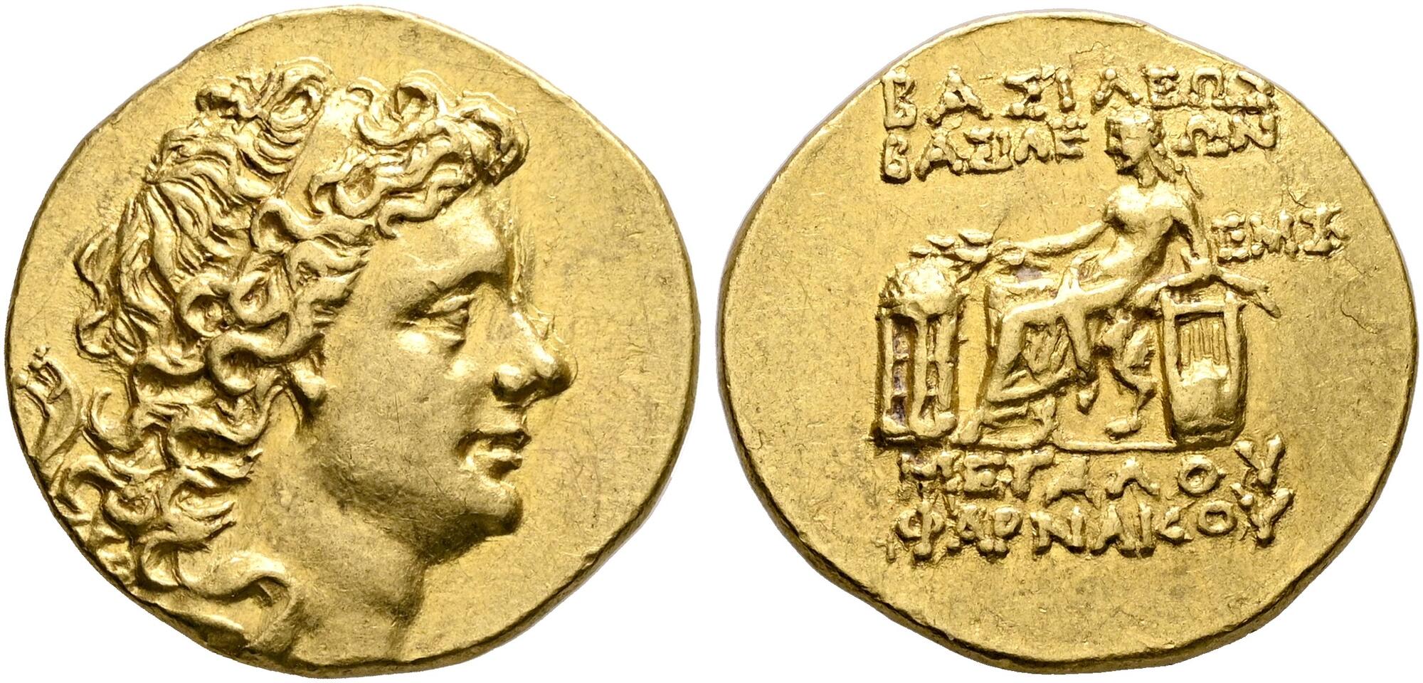 ГлавнаяКаталог монетПаспорт монеты Паспорт монеты: 218-4331-5 Дополнительная информация о монете Leu Numismatik. Auction 17. Lot 164. From the Hestia Collection, acquired from Peus before 2000. Номер:218-4331 Количество монет в архиве:5 монет Центр чеканки:Пантикапей Период чеканки: по Анохину В.А. (1986 г.)53 — 52 год до н.э. по Анохину В.А. (2011 г.)53 — 52 год до н.э. по Шелову Д.Б. по Фроловой Н.А. по MacDonald D.53 — 52 год до н.э. по Шонову И.В. Правитель, годы правления:Фарнак, 63-47 гг до н. э. Материал монеты:Золото Номинал:Статер Вес монеты:8.13 Диаметр монеты:19.0 Описание аверса:Голова царя вправо Описание реверса:ΒΑΣΙΛΕΩΣ ΒΑΣΙΛΕΩΝ ΜΕΓΑΛΟΥ ΦΑΡΝΑΚΟΥ. Аполлон на троне влево, слева треножник, справа лира и ЕМΣ Номер по каталогу: Анохина В.А. (1986 г.)218 Анохина В.А. (2011 г.)1303 Шелова Д.Б.- Фроловой Н.А. MacDonald D.184/1 Шонова И.В. Архив монет данного типа 218-4331-1 Пантикапей. 53 — 52 год до н.э. Золото Статер, вес 8.25 г, d22.0 мм 218-4331-2 Пантикапей. 53 — 52 год до н.э. Золото Статер, вес 8.08 г, d20.0 мм 218-4331-3 Пантикапей. 53 — 52 год до н.э. Золото Статер, вес 8.16 г, d0.0 мм 218-4331-4 Пантикапей. 53 — 52 год до н.э. Золото Статер, вес 8.19 г, d21.0 мм 218-4331-5 Пантикапей. 53 — 52 год до н.э. Золото Статер, вес 8.13 г, d19.0 мм