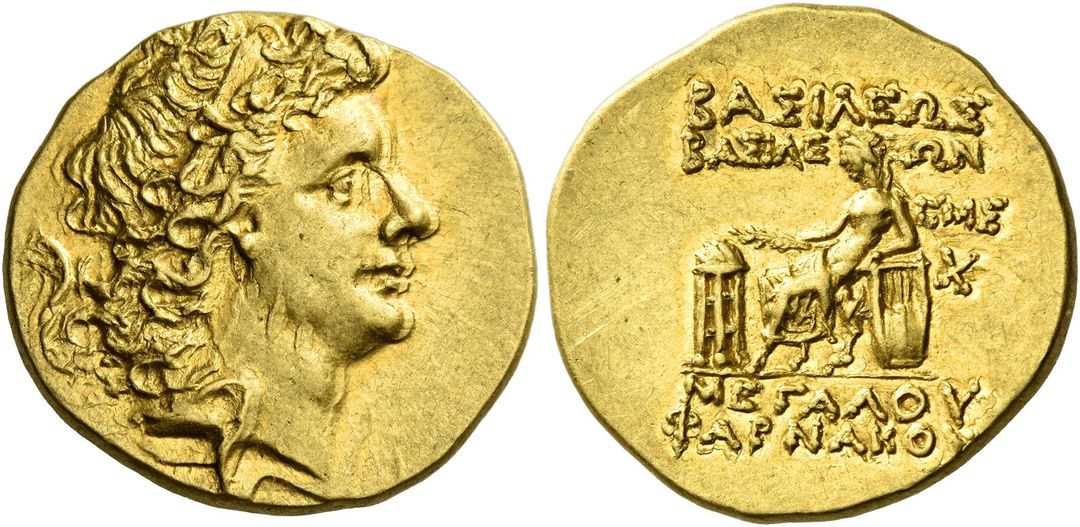 ГлавнаяКаталог монетПаспорт монеты Монета: 219-4713 Дополнительная информация о монете Numismatica Ars Classica NAC AG. Auction 133. Lot 101. Номер:219-4713 Количество монет в архиве:2 монет Центр чеканки:Пантикапей Период чеканки: по Анохину В.А. (1986 г.)52 — 51 год до н.э. по Анохину В.А. (2011 г.)52 — 51 год до н.э. по Шелову Д.Б. по Фроловой Н.А. по MacDonald D.52 — 51 год до н.э. по Шонову И.В.52 — 51 год до н.э. Правитель, годы правления:Фарнак, 63-47 гг до н. э. Материал монеты:Золото Номинал:Статер Вес монеты:8.02 Диаметр монеты:0.0 Описание аверса:Голова царя вправо. Описание реверса:ΒΑΣΙΛΕΩΣ ΒΑΣΙΛΕΩΝ ΜΕΓΑΛΟΥ ΦΑΡΝΑΚΟΥ. Аполлон на троне влево, треножник, справа лира ,ςМΣ. П Номер по каталогу: Анохина В.А. (1986 г.)219 Анохина В.А. (2011 г.)1304 Шелова Д.Б.- Фроловой Н.А. MacDonald D.185/2 Шонова И.В.Таб. LIII, № 447 Архив монет данного типа 219-4713-2 Пантикапей. 52 — 51 год до н.э. Золото Статер, вес 8.02 г, d0.0 мм 219-4713-1 Пантикапей. 52 — 51 год до н.э. Золото Статер, вес 0.00 г, d0.0 мм