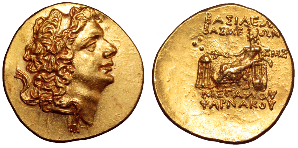ГлавнаяКаталог монетПаспорт монеты Паспорт монеты: 219-4881-1 Дополнительная информация о монете Roma Numismatics Ltd. Auction VII (22 March 2014). Lot 765.Комментарий:ςМΣ (246г.) ---------------- Номер по каталогу Анохина В.А. (1986 г.) дан условно. Номер:219-4881 Количество монет в архиве:2 монет Центр чеканки:Пантикапей Период чеканки: по Анохину В.А. (1986 г.)52 — 51 год до н.э. по Анохину В.А. (2011 г.)52 — 51 год до н.э. по Шелову Д.Б. по Фроловой Н.А. по MacDonald D.52 — 51 год до н.э. по Шонову И.В.52 — 51 год до н.э. Правитель, годы правления:Фарнак, 63-47 гг до н. э. Материал монеты:Золото Номинал:Статер Вес монеты:8.25 Диаметр монеты:20.0 Описание аверса:Голова царя вправо. Описание реверса:ΒΑΣΙΛΕΩΣ ΒΑΣΙΛΕΩΝ ΜΕΓΑΛΟΥ ΦΑΡΝΑΚΟΥ.Аполлон на троне влево,слева треножник,три точки,справа лира, 	 Номер по каталогу: Анохина В.А. (1986 г.)219 Анохина В.А. (2011 г.)1307 Шелова Д.Б.- Фроловой Н.А.- MacDonald D.185/3 Шонова И.В.Таб. LIII, № 448 Архив монет данного типа 219-4881-1 Пантикапей. 52 — 51 год до н.э. Золото Статер, вес 8.25 г, d20.0 мм 219-4881-2 Пантикапей. 52 — 51 год до н.э. Золото Статер, вес 0.00 г, d0.0 мм