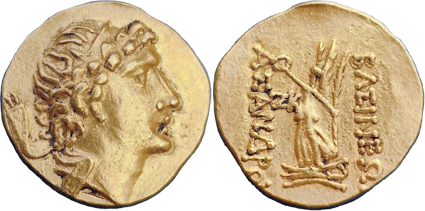 ГлавнаяКаталог монетПаспорт монеты Монета: 243-5311 Комментарий:Подражания типу 243-3201 -------------- Номер и датировка по каталогу (1986г.) В.А.Анохина даны справочно. Номер:243-5311 Количество монет в архиве:1 монет Центр чеканки:Подражания Период чеканки: по Анохину В.А. (1986 г.)24 — 23 год до н.э. по Анохину В.А. (2011 г.) по Шелову Д.Б. по Фроловой Н.А. по MacDonald D. по Шонову И.В. Правитель, годы правления:Асандр с титулом царя, 47/46-22/21 гг до н. э. Материал монеты:Золото Номинал:Статер Вес монеты:7.57 Диаметр монеты:0.0 Описание аверса:Голова Асандра в диадеме вправо Описание реверса:ΒΑΣΙΝΕΩΣ ΑΣΑΝΔΡΟΥ. Нике с венком и ветвью на проре влево, ZΚ (27-й год правления) Номер по каталогу: Анохина В.А. (1986 г.)243 Анохина В.А. (2011 г.)- Шелова Д.Б.- Фроловой Н.А.- MacDonald D.- Шонова И.В.- Архив монет данного типа 243-5311-1 Подражания. 24 — 23 год до н.э. Золото Статер, вес 7.57 г, d0.0 мм