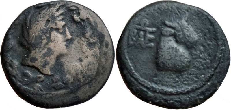 Голова Деметры в калафе, вправо.Изображение помещено в венок.