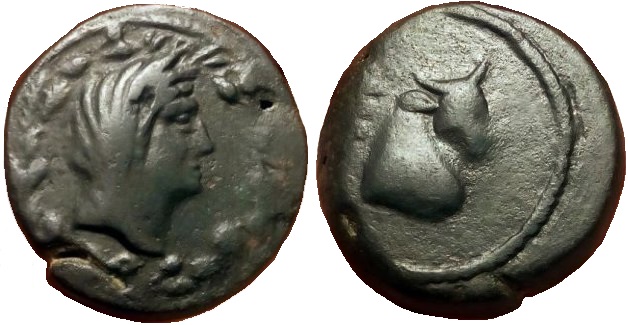 Голова Деметры в калафе, вправо.Изображение помещено в венок.