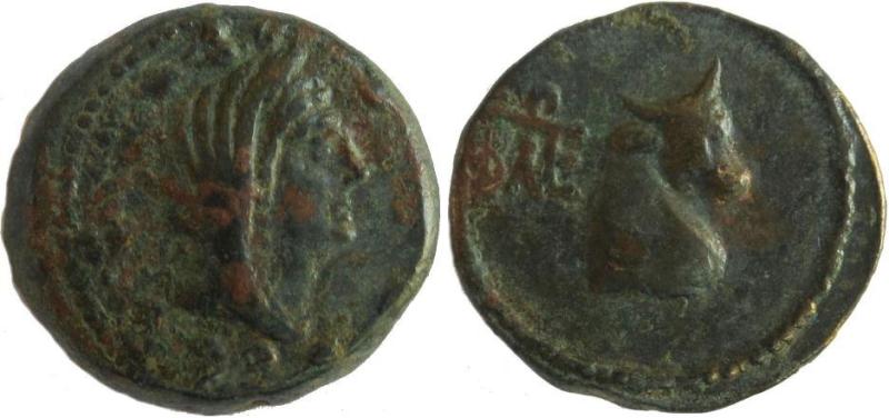Голова Деметры в калафе, вправо.Изображение помещено в венок.