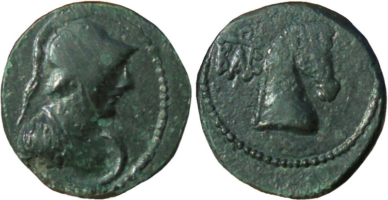 Бюст Афины в шлеме, вправо. За левым плечом - щит.