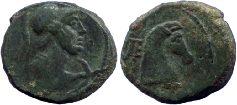 Бюст Афины в шлеме, вправо. За левым плечом - щит.