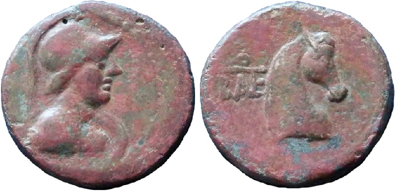 Бюст Афины в шлеме, вправо. За левым плечом - щит.