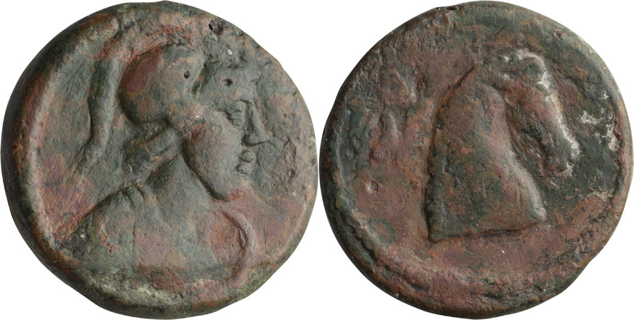 Бюст Афины в шлеме, вправо. За левым плечом - щит.
