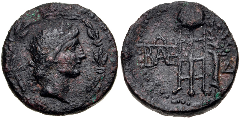 - Бюст Аполлона в лавровом венке, вправо. Изображение помещено в венок.