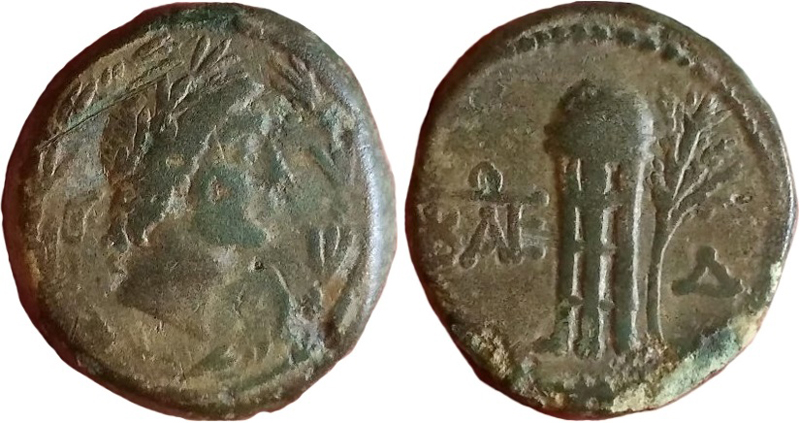 - Бюст Аполлона в лавровом венке, вправо. Изображение помещено в венок.