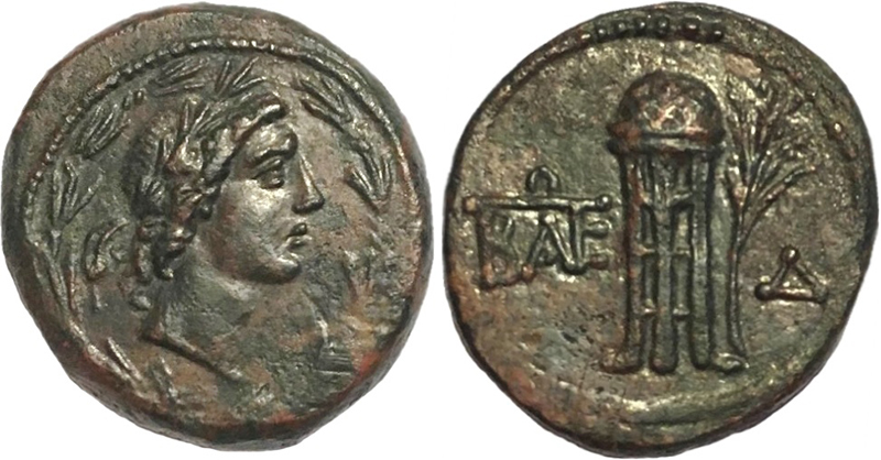 - Бюст Аполлона в лавровом венке, вправо. Изображение помещено в венок.