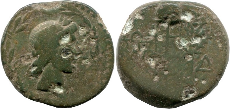 - Бюст Аполлона в лавровом венке, вправо. Изображение помещено в венок.
