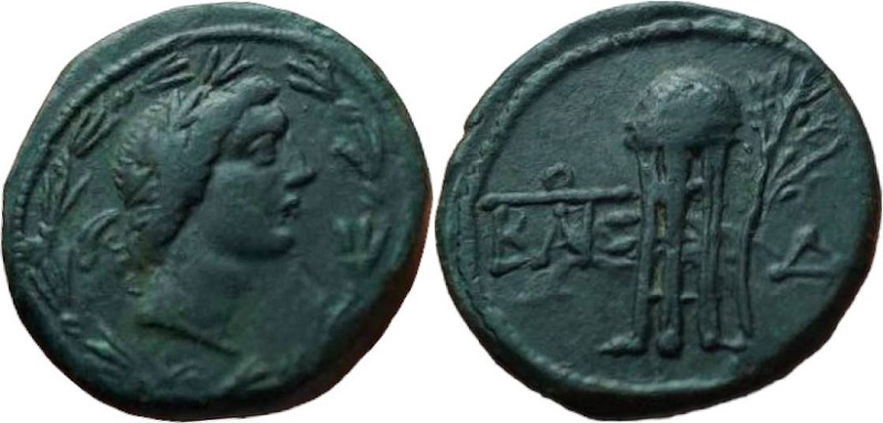 - Бюст Аполлона в лавровом венке, вправо. Изображение помещено в венок.