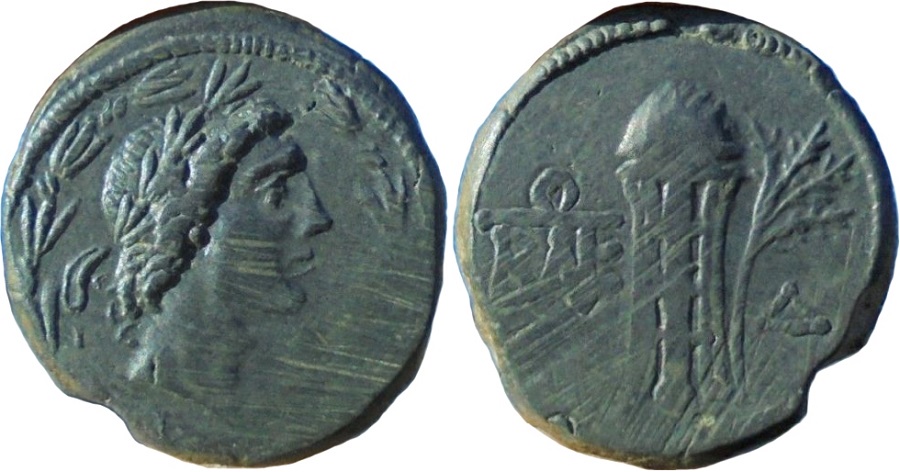 - Бюст Аполлона в лавровом венке, вправо. Изображение помещено в венок.
