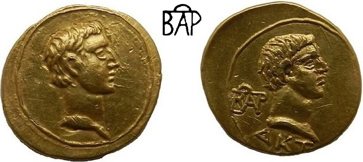 Голова Агриппы вправо, слева монограмма ΒΑΡ, год ΔΚΤ (324 г. б. э.)
