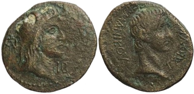 - Голова Аспурга вправо, слева монограмма ΒΑΡ, справа ΙΒ