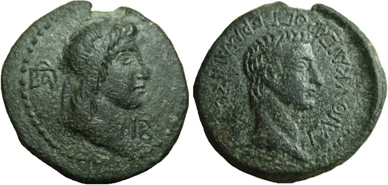 - Голова Аспурга вправо, слева монограмма ΒΑΡ, справа ΙΒ