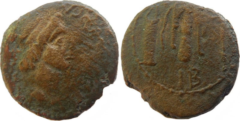 - Палица с наброшенной на нее шкура льва, слева лук и колчан, справа трезубец, внизу ΙΒ