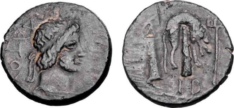 - Палица с наброшенной на нее шкура льва, слева лук и колчан, справа трезубец, внизу ΙΒ