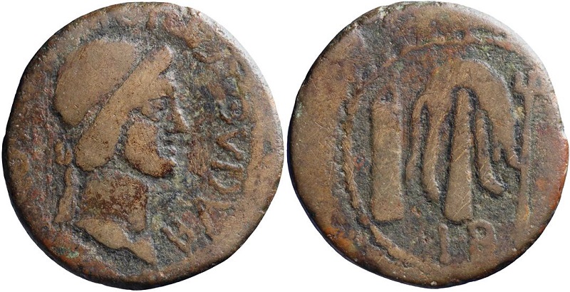 - Палица с наброшенной на нее шкура льва, слева лук и колчан, справа трезубец, внизу ΙΒ