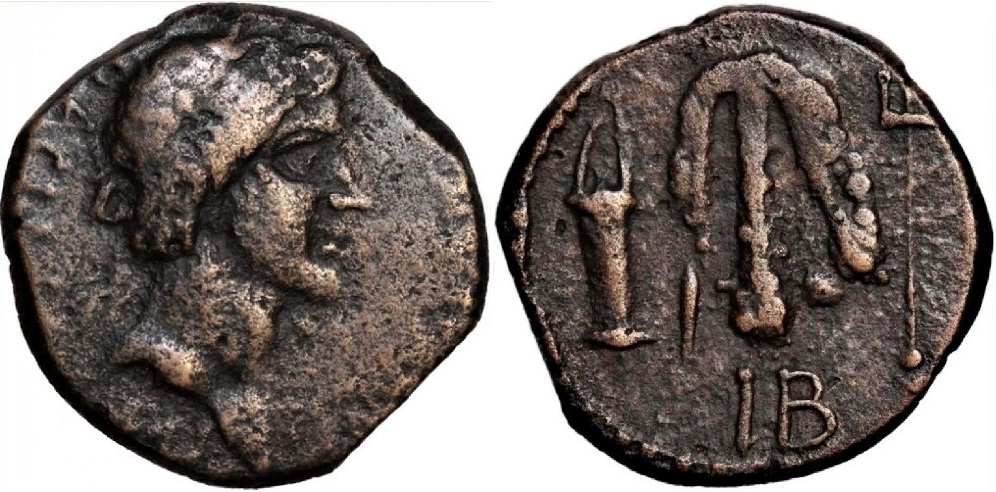 - Палица с наброшенной на нее шкура льва, слева лук и колчан, справа трезубец, внизу ΙΒ