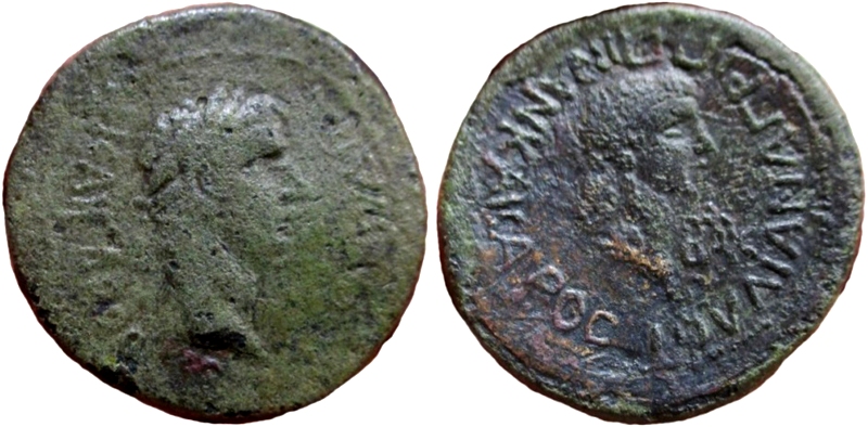 ΙΟΥΛΙΑΝ ΑΓΡΙΠΠΙΝΑΝ ΚΑΙCΑΡΟC .Бюст Агриппины вправо, справа монограмма BAK.