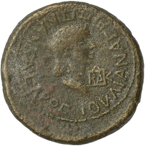 ΙΟΥΛΙΑΝ ΑΓΡΙΠΠΙΝΑΝ ΚΑΙCΑΡΟC .Бюст Агриппины вправо, справа монограмма BAK.