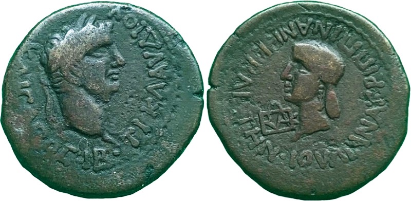 - ΙΟΥΛΙΑΝ ΑΓΡΙΠΠΙΝΑΝ CΕΒΑCΤΗΝ. Голова Агриппины влево, слева монограмма ΒΑΚ
