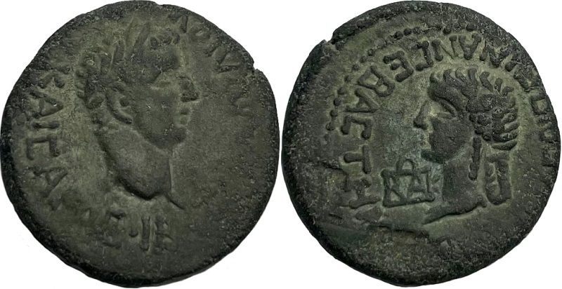 - ΙΟΥΛΙΑΝ ΑΓΡΙΠΠΙΝΑΝ CΕΒΑCΤΗΝ. Голова Агриппины влево, слева монограмма ΒΑΚ