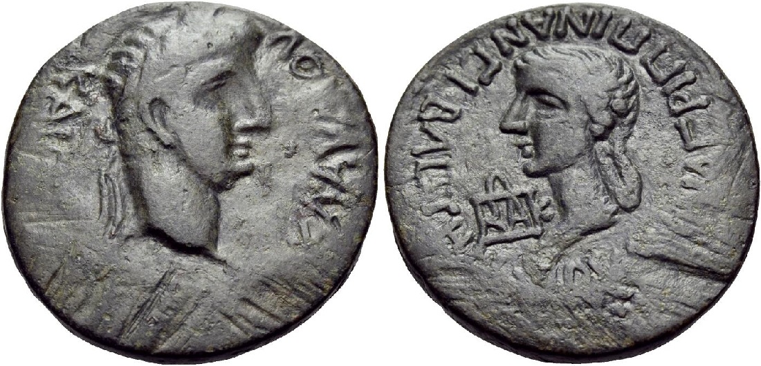 - ΙΟΥΛΙΑΝ ΑΓΡΙΠΠΙΝΑΝ CΕΒΑCΤΗΝ. Голова Агриппины влево, слева монограмма ΒΑΚ