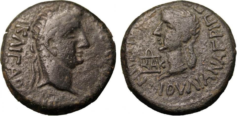 - ΙΟΥΛΙΑΝ ΑΓΡΙΠΠΙΝΑΝ CΕΒΑCΤΗΝ. Голова Агриппины влево, слева монограмма ΒΑΚ