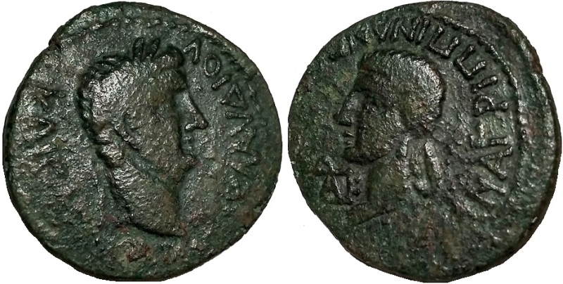 - ΙΟΥΛΙΑΝ ΑΓΡΙΠΠΙΝΑΝ CΕΒΑCΤΗΝ. Голова Агриппины влево, слева монограмма ΒΑΚ