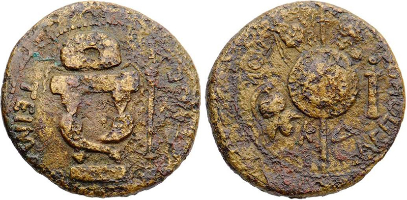 - ΤΟΥ ΑCΠΟΥΡΓΟΥ. Круглый щит и копье, слева голова коня и шлем, справа голова и меч, внизу ΚΔ