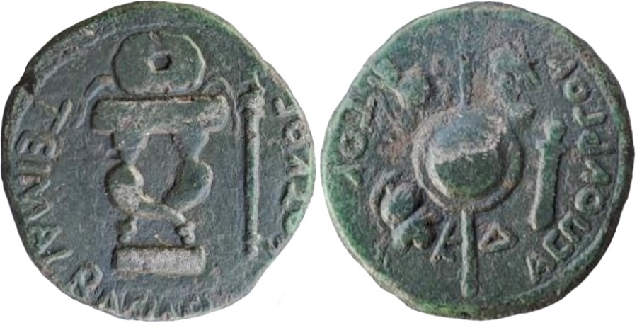 - ΤΟΥ ΑCΠΟΥΡΓΟΥ. Круглый щит и копье, слева голова коня и шлем, справа голова и меч, внизу ΚΔ