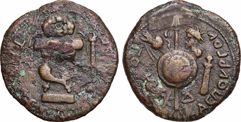 - ΤΟΥ ΑCΠΟΥΡΓΟΥ. Круглый щит и копье, слева голова коня и шлем, справа голова и меч, внизу ΚΔ