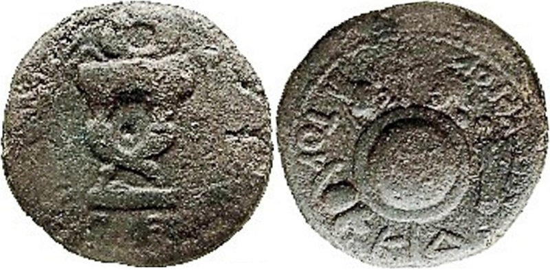 - ΤΟΥ ΑCΠΟΥΡΓΟΥ. Круглый щит и копье, слева голова коня и шлем, справа голова и меч, внизу ΚΔ