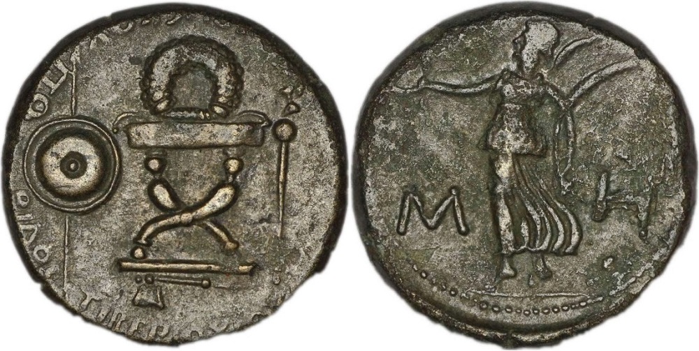 Номер по каталогу (1986 г.) В.А.Анохина дан справочно, так как монеты этого типа с такой разновидностью аверса (топор под курульным креслом) в его каталоге не отмечены.