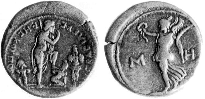 - Нике с венком в левой руке, влево. В правой руке - пальмовая ветвь, по сторонам - "МН"