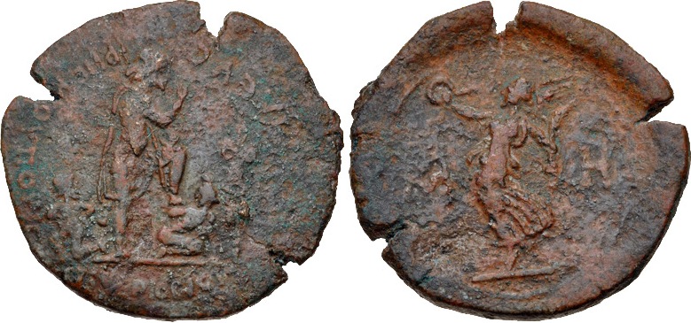 - ΤΙΒΕΡΙΟC ΙΟΥΛΙΟC ΒΑCΙΛΕΥC ΡΗCΚΟΥΠΟΡΙC. Царь, попирающий пленника, вправо. Слева - второй пленник, справа - трофей