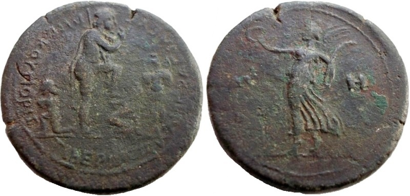 - ΤΙΒΕΡΙΟC ΙΟΥΛΙΟC ΒΑCΙΛΕΥC ΡΗCΚΟΥΠΟΡΙC. Царь, попирающий пленника, вправо. Слева - второй пленник, справа - трофей