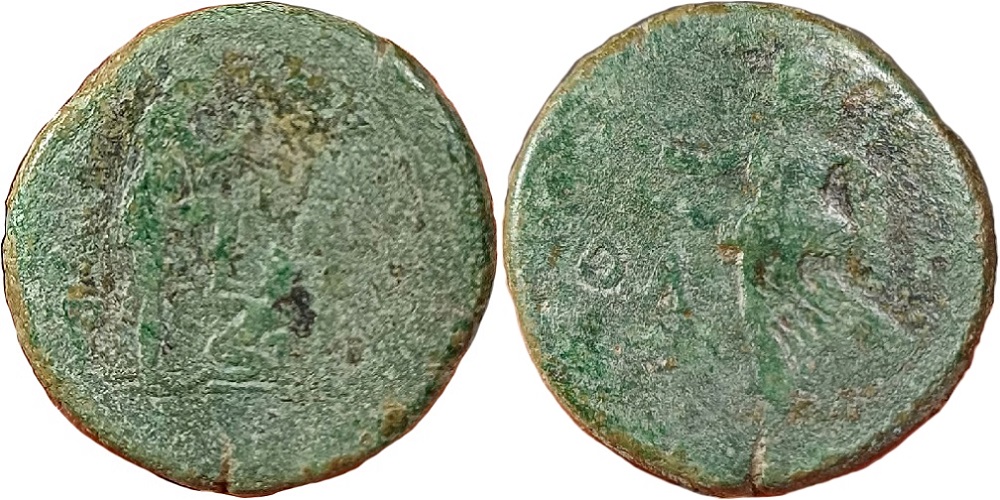 - ΤΙΒΕΡΙΟC ΙΟΥΛΙΟC ΒΑCΙΛΕΥC ΡΗCΚΟΥΠΟΡΙC. Царь, попирающий пленника, вправо. Слева - второй пленник, справа - трофей