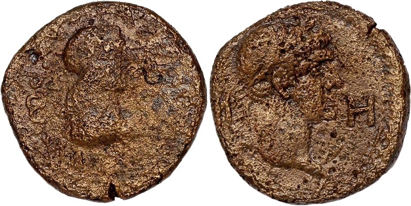 Бюст Траяна вправо, по сторонам ΜΗ