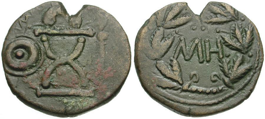- ΒΑCΙΛΕωC CΑΥΡΟΜΑΤΟΥ. Курульное кресло с венком, слева круглый щит и копье, справа скипетр с бюстом