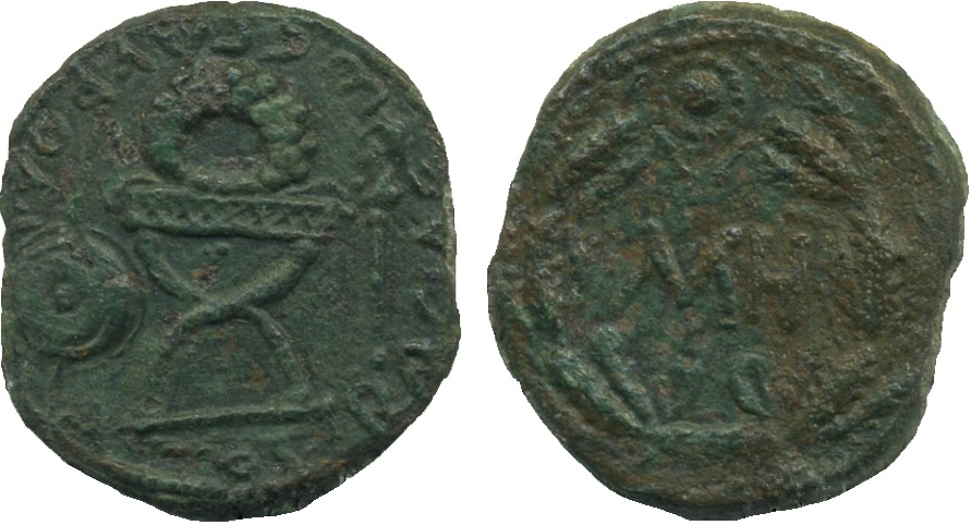 - ΒΑCΙΛΕωC CΑΥΡΟΜΑΤΟΥ. Курульное кресло с венком, слева круглый щит и копье, справа скипетр с бюстом