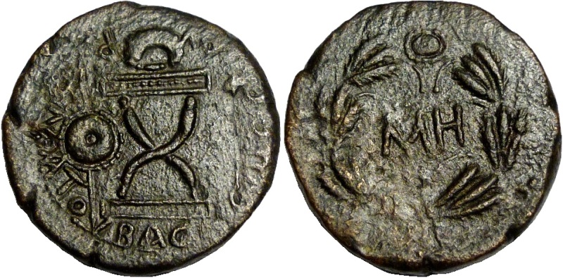 - ΒΑCΙΛΕωC CΑΥΡΟΜΑΤΟΥ. Курульное кресло с венком, слева круглый щит и копье, справа скипетр с бюстом