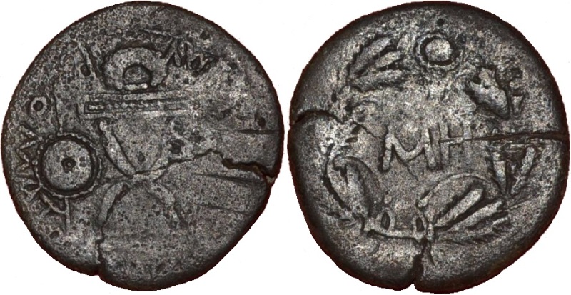 - ΒΑCΙΛΕωC CΑΥΡΟΜΑΤΟΥ. Курульное кресло с венком, слева круглый щит и копье, справа скипетр с бюстом