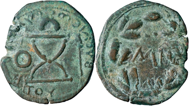 - ΒΑCΙΛΕωC CΑΥΡΟΜΑΤΟΥ. Курульное кресло с венком, слева круглый щит и копье, справа скипетр с бюстом